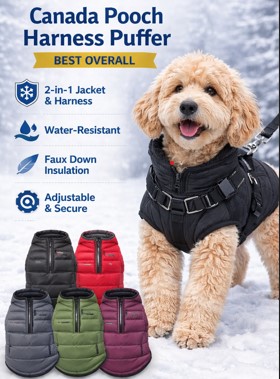The Canada Pooch Harness Puffer is widely considered the best dog winter coat with harness in 2026. It combines a thick insulated puffer design with a strong built-in harness, making it ideal for cold climates and snowy walks.